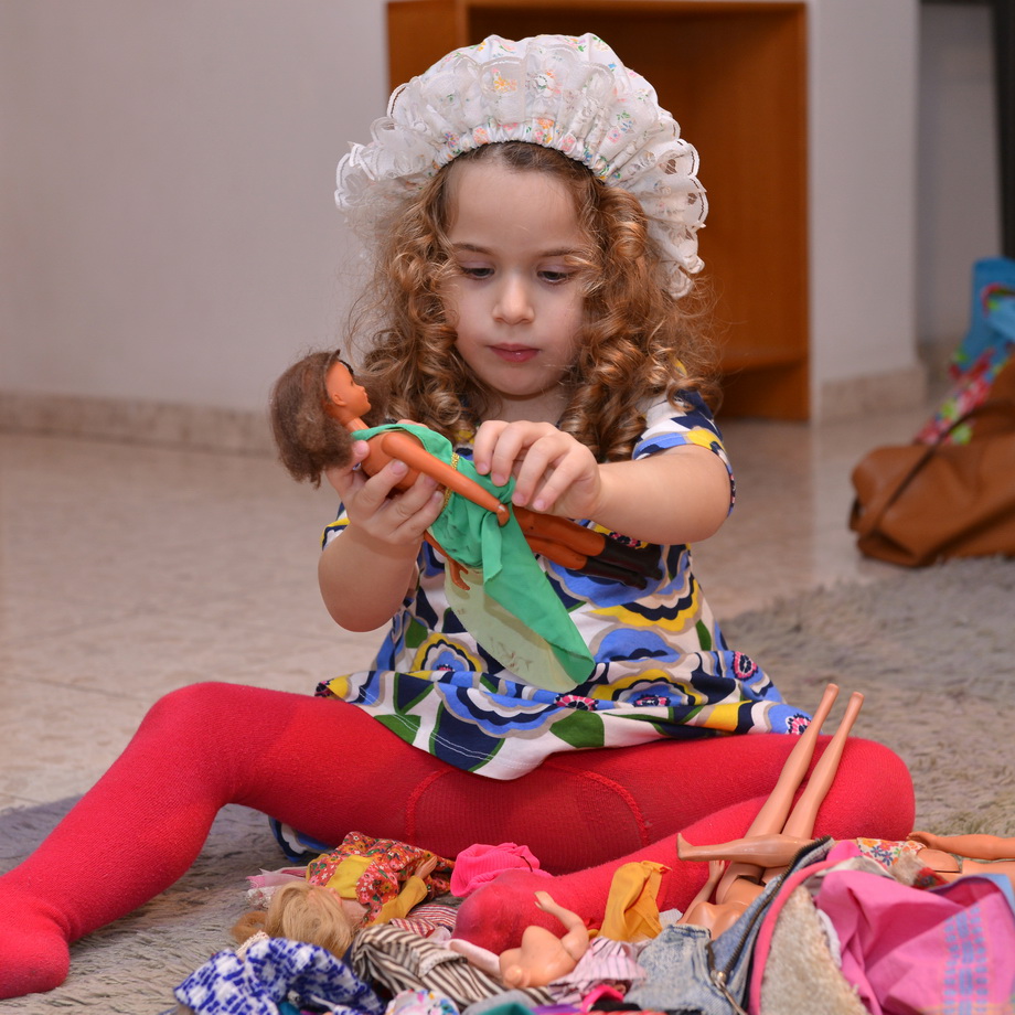 אז בשבת, כשמצאתי את קופסת הברביות עלמיק מיד התלהבה מכל עניין ה-להלביש/להפשיט/לסרק ואני נזכרתי כמה שזה כיף. לא יודעת מה אני חושבת על זה מבחינה תרבותית-חינוכית.