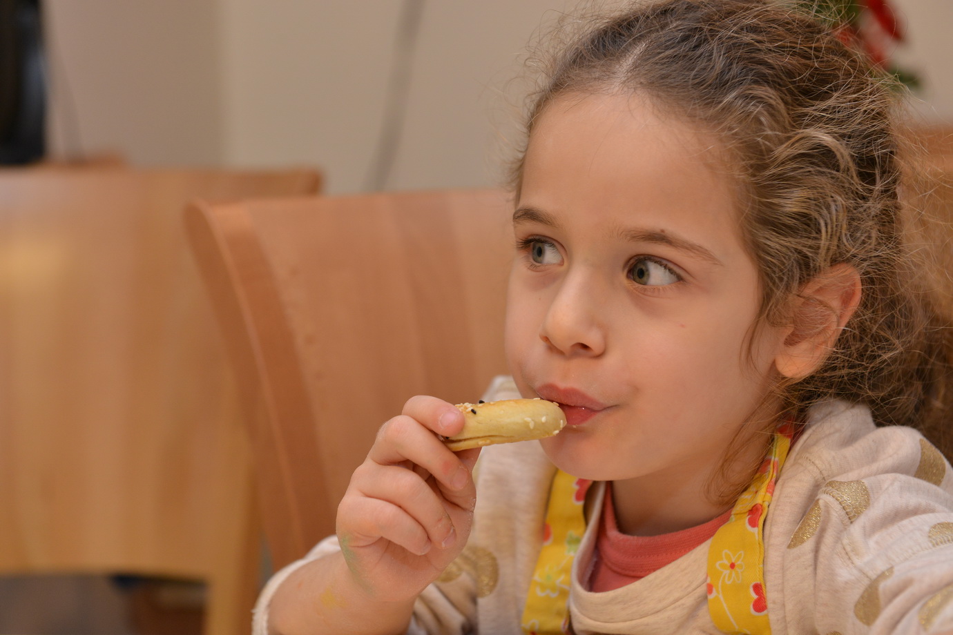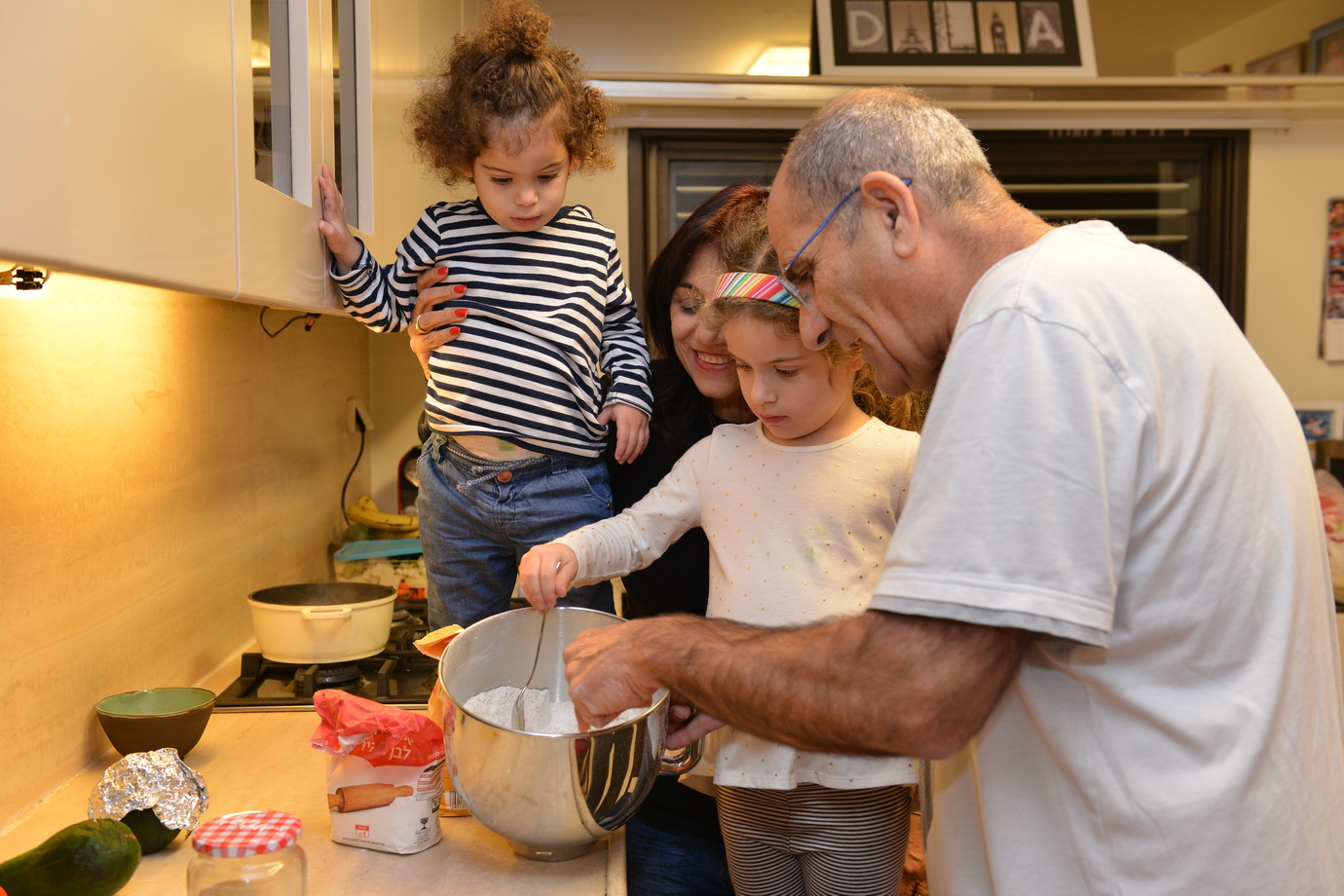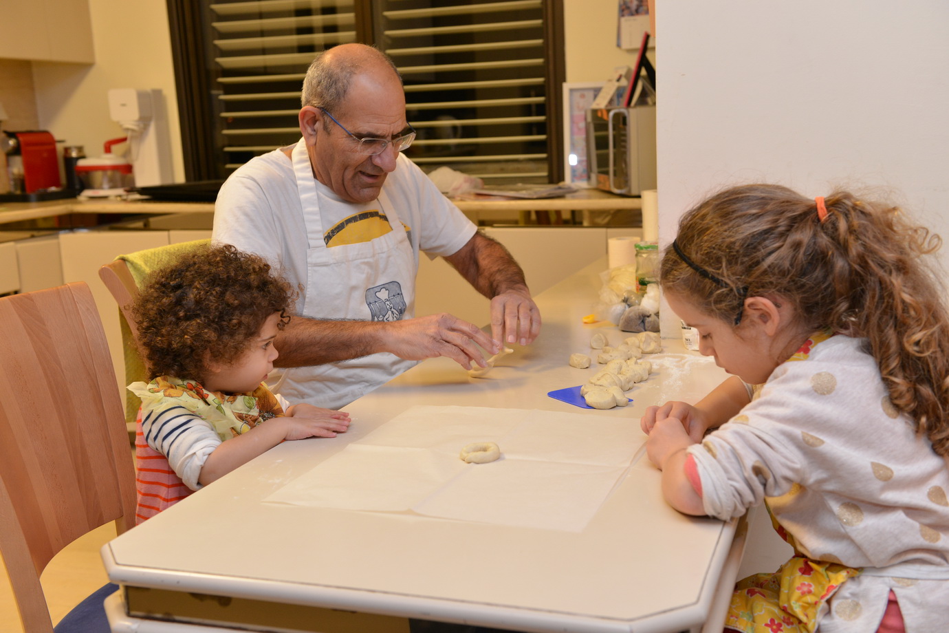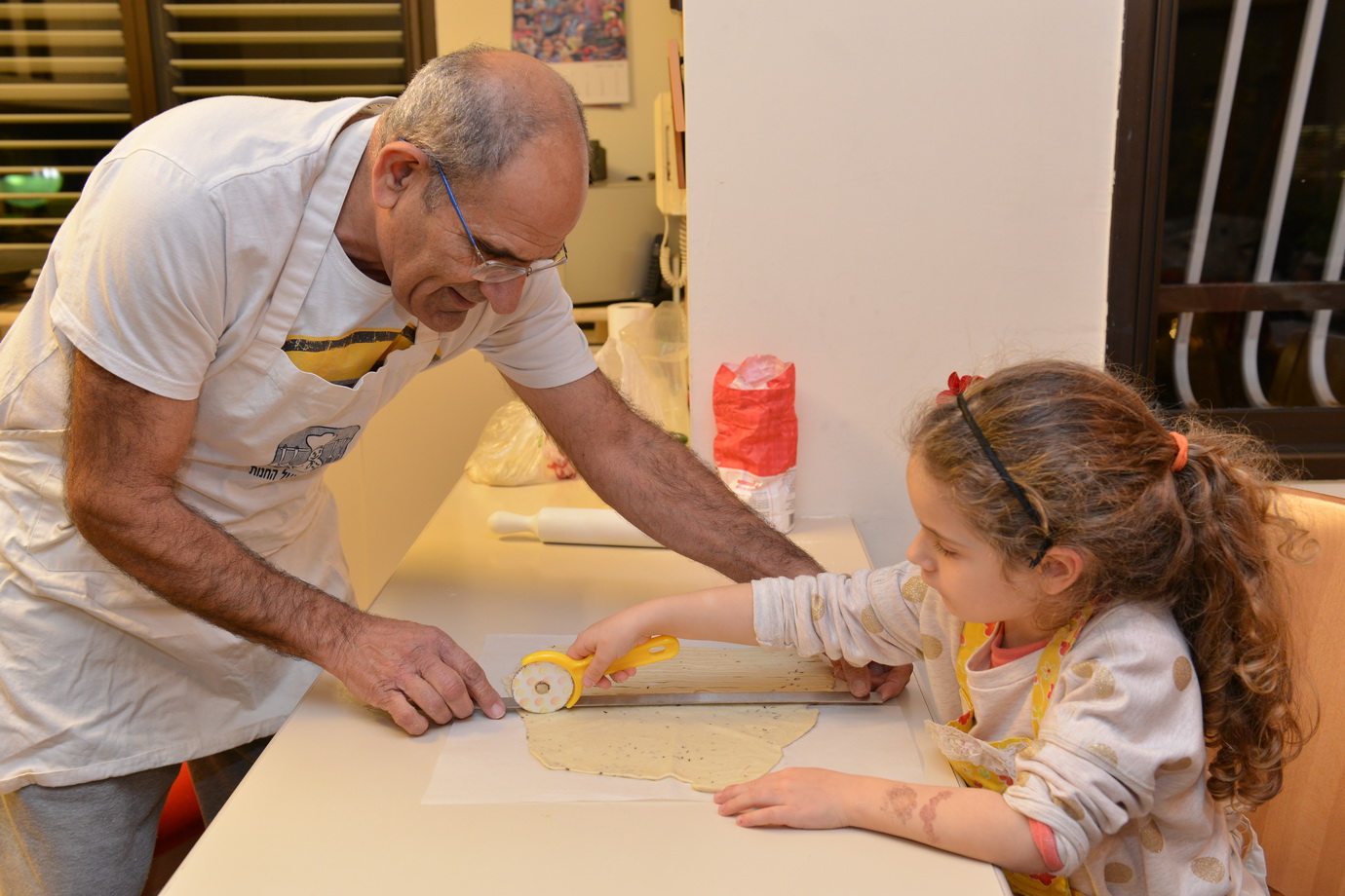 וזה קצת קשה לו "לשחרר". אז הוא קצת מקטר (כי זה עקום) וממלמל (כי זה דק מדי) וקצת מזרז (כי כל התהליך קורה במקביל וחוץ ממנו אף אחד לא מספיק לעקוב: מה צריך להכין עכשיו? לרדד לפיתות? לגלגל לכעכים? לפזר סומסום?). אבל בגלל שהוא אוהבאת הנכדים יותר מכל, באמת באמת באמת, אז הוא מצליח "לשחרר". ומרשה להם ללכלך, ולטעום, ולפזר, ולחתוך עקום (וקצת מיישר אחר כך כשהם לא רואים).