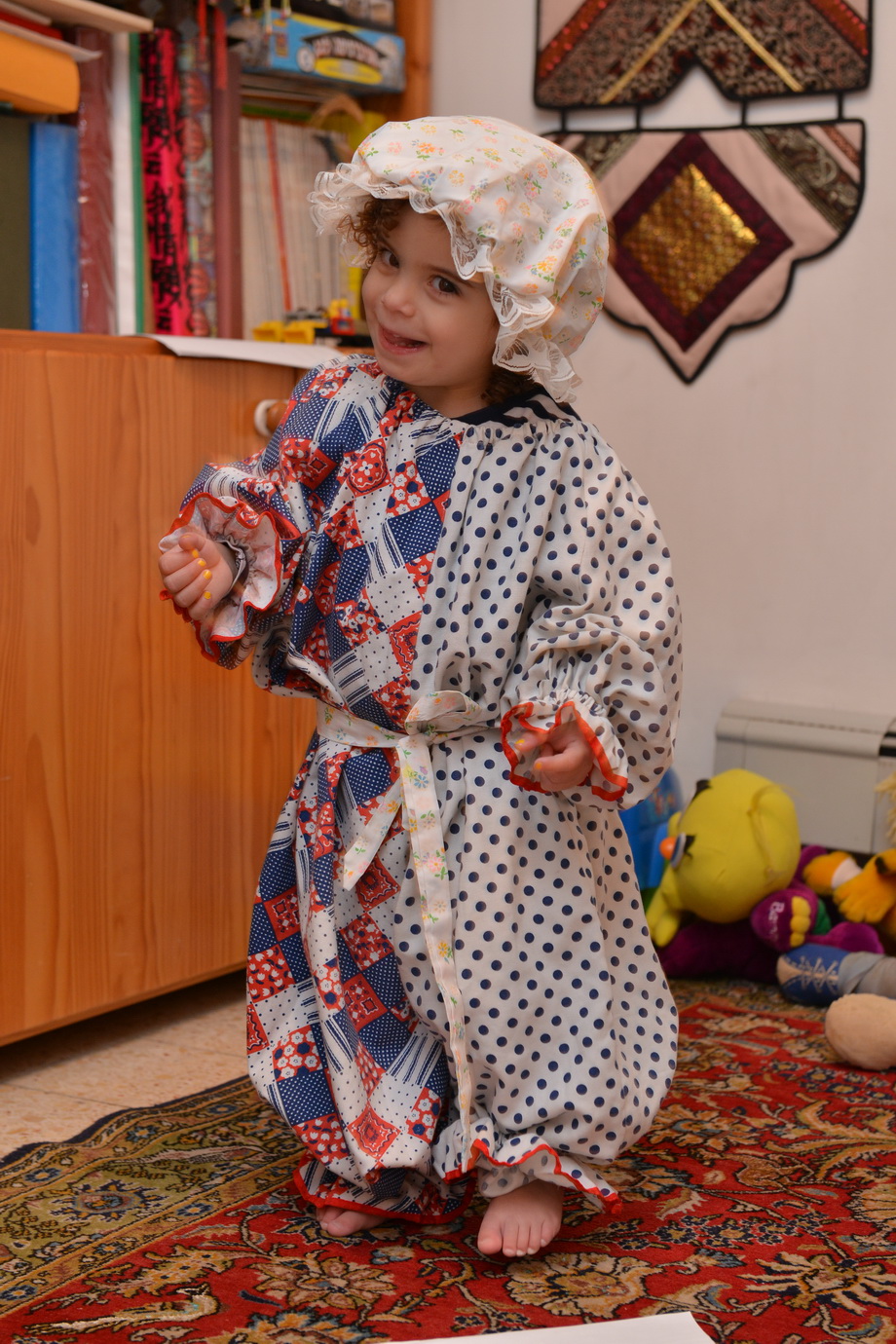 כשביקרנו עם עלמיק בפעם הראשונה בונקובר האחייניות המתוקות שלי לקחו את עלמה בת השנה-וחצי לחדר, ואחרי כמה דקות היא יצאה לבושה כנסיכה, מרוצה כולה מתשומת לב ומהשמלה הארוכה והמפוארת. אחרי כמה דקות כשנמאס לה הן הלכו להחליף ושוב היא יצאה, הפעם מקושטת סרטים ולבושה בתחפושת הליצן שאמי תפרה לפני שנים לאחותי. (לפני שנים הכוונה ארבעים שנה כזה).