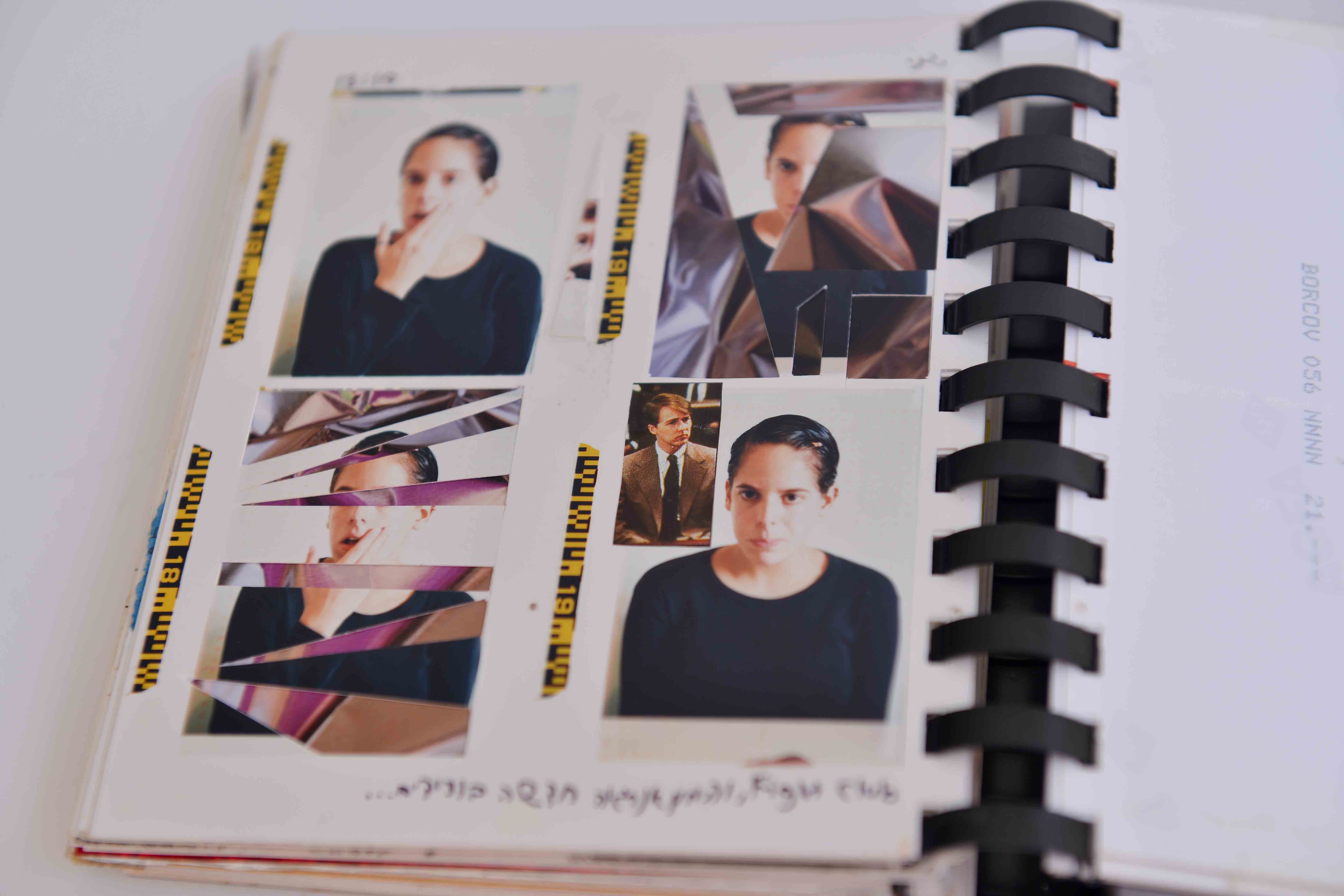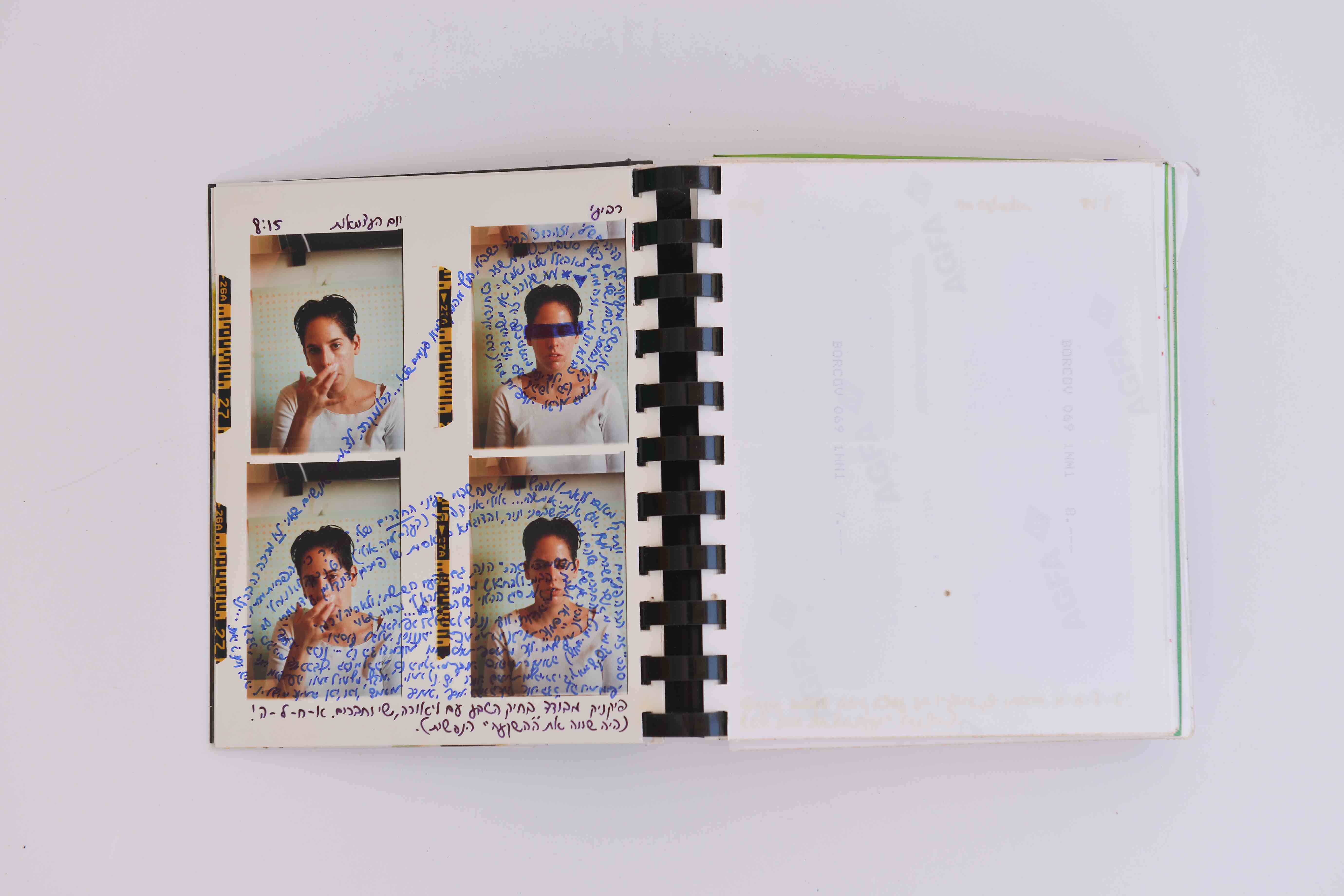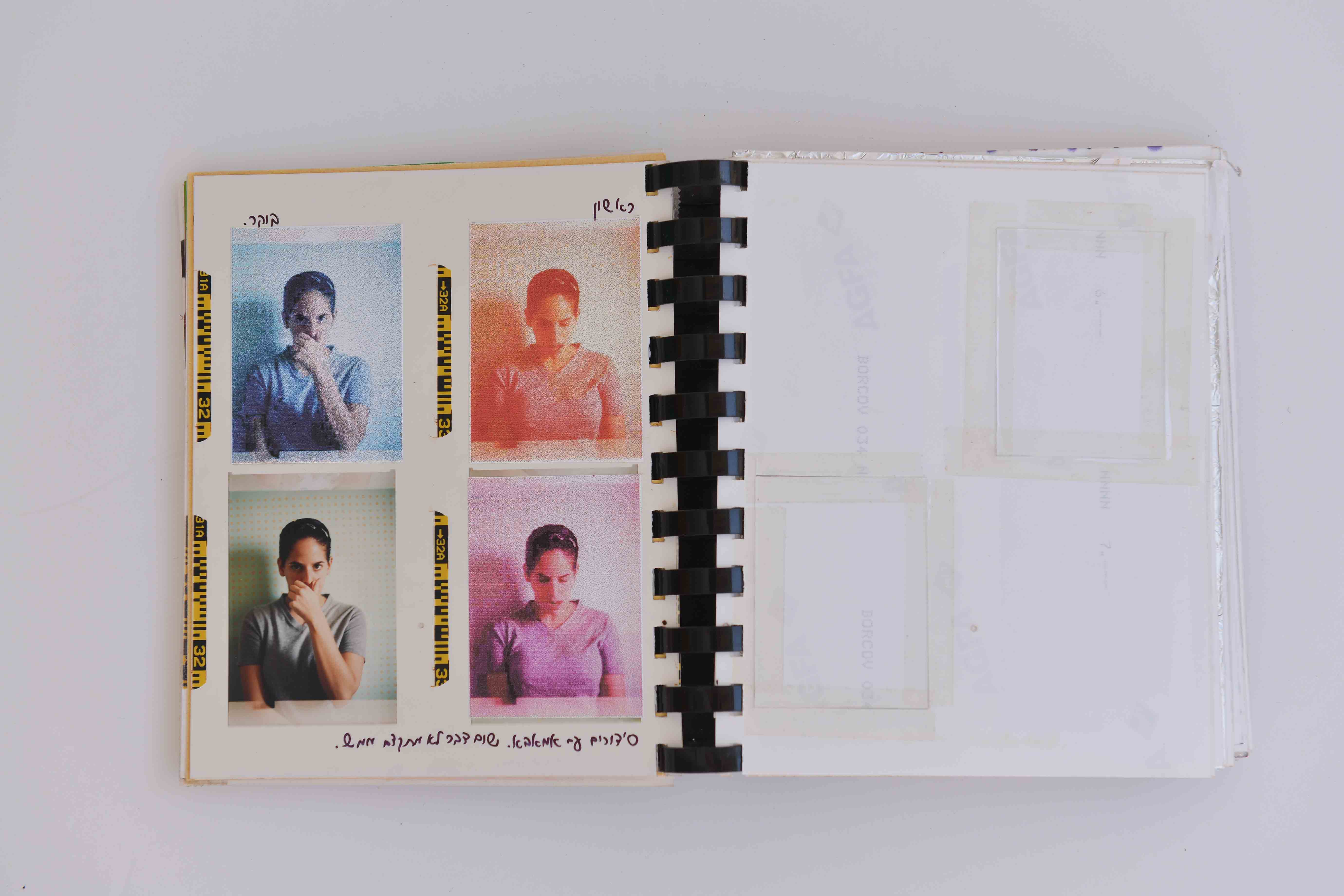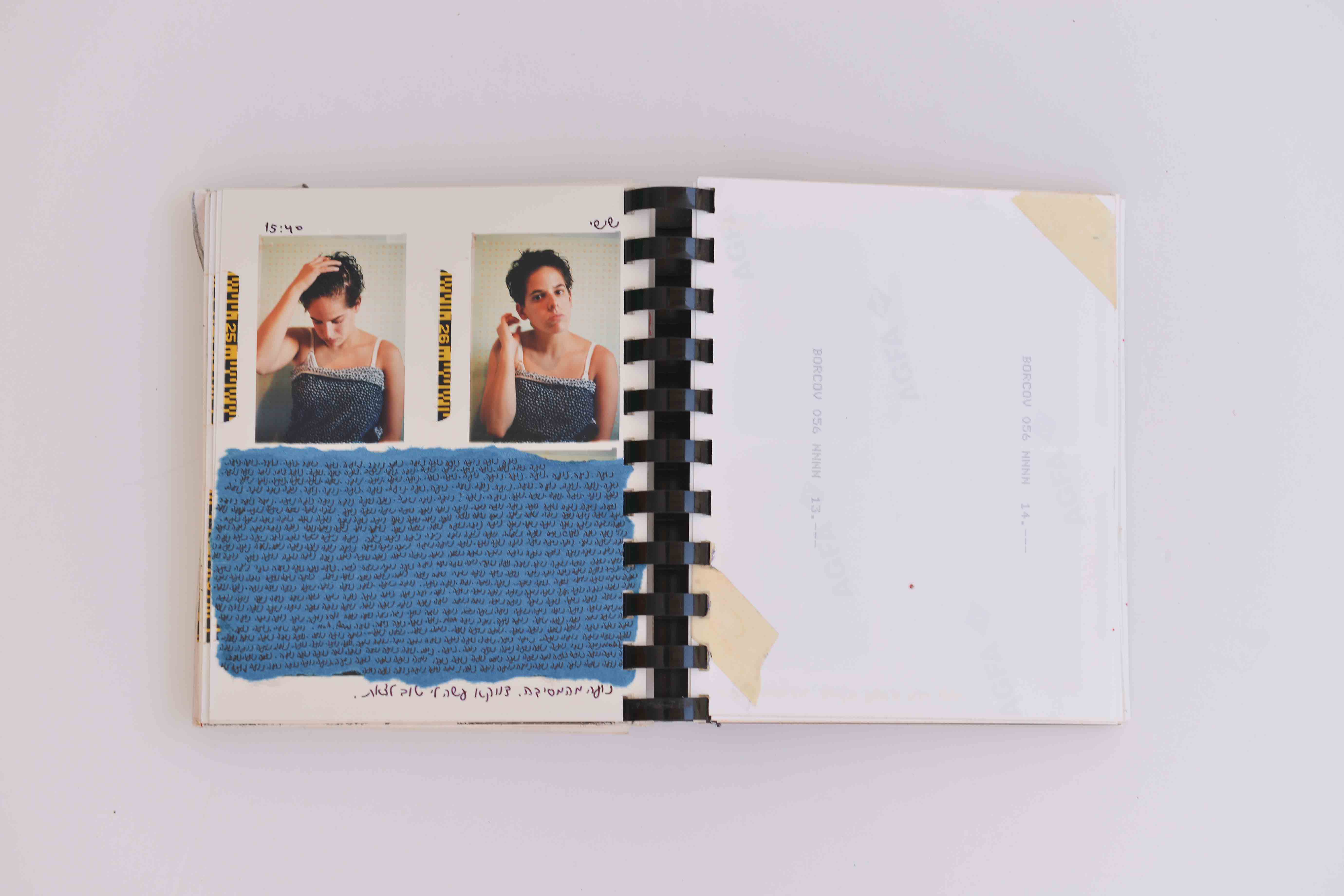 את היומן הזה צילמתי במשך כמעט שלושה חודשים, בפברואר עד מאי 2000, עד שהתחלתי בסבב ועדות הקבלה שעשיתי לבתי ספר השונים לאמנות ולצילום בארץ. הצבתי מצלמה על חצובה בנקודה קבועה בחדר בבית הורי, המצלמה פנתה לשרפרף עליו הייתי יושבת, וברקע בריסטול שתליתי. המצלמה הזו היתה קבועה שם (מצלמה ידנית של אבי, כדי שאוכל להמשיך לצלם במצלמה שלי במקביל). הייתי מצלמת בכל יום שני פריימים בלבד. בדף נפרד כתבתי לי את היום, שעת הצילום, וכמה מילים על כל יום, כדי שאוכל לכתוב ליד התמונה בהמשך. את הפילמים נתתי לפיתוח ולהדפסה בצורת "קונטקט" ב"סטודיו בבורוכוב". הם היו מדפיסים את הקונטקטים שלהם בצורה כזו של שתי תמונות בדף. בהמשך, את דפי הקונטקטים כרכתי ואז התחלתי לעשות בהם את העבודה המשנית, ציורים, חיתוכים, מה שתחשק לי (וכמובן עדיף שיהיה מעניין ויראה לוועדות הקבלה כמה שאני יצירתית ומגוונת…).