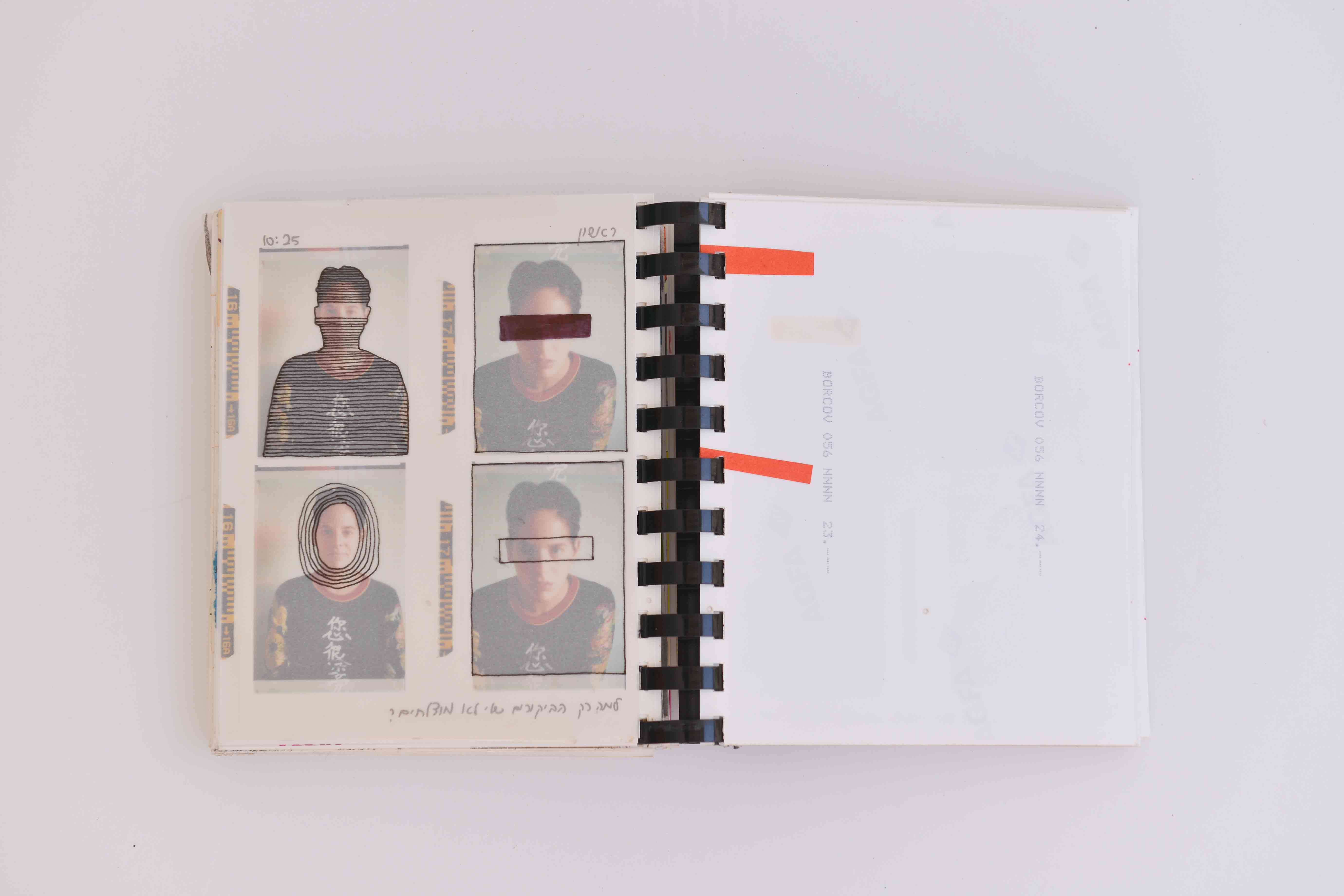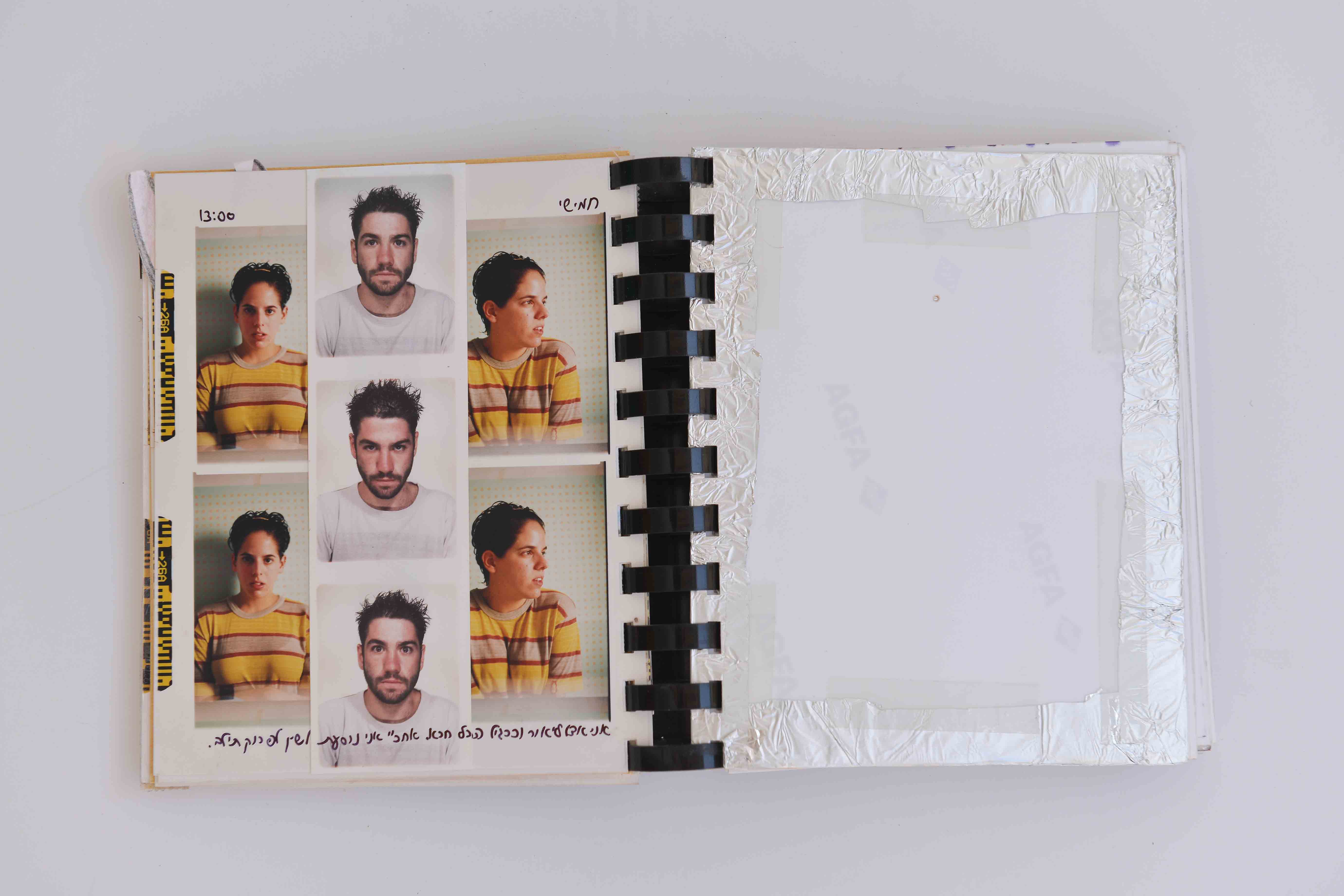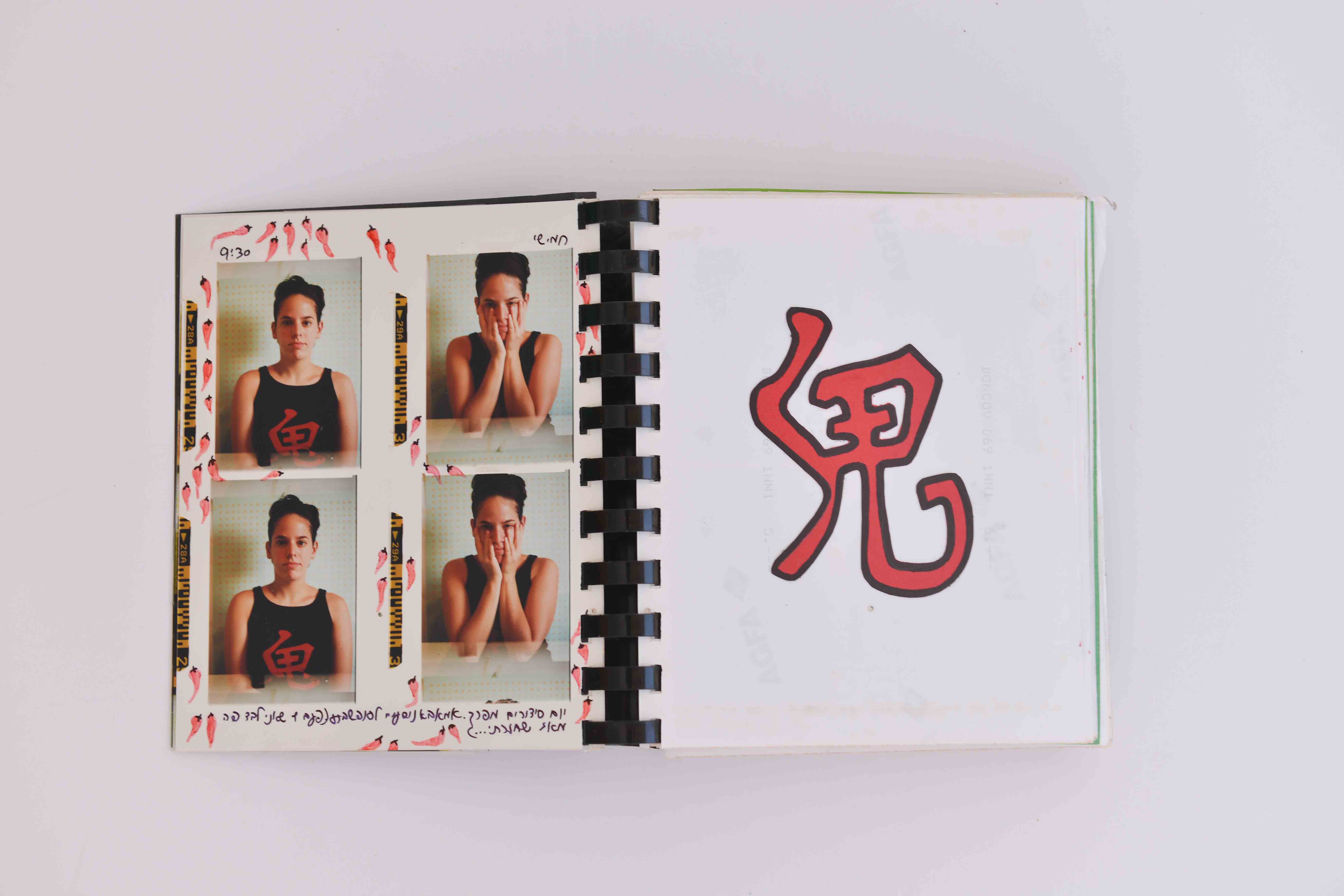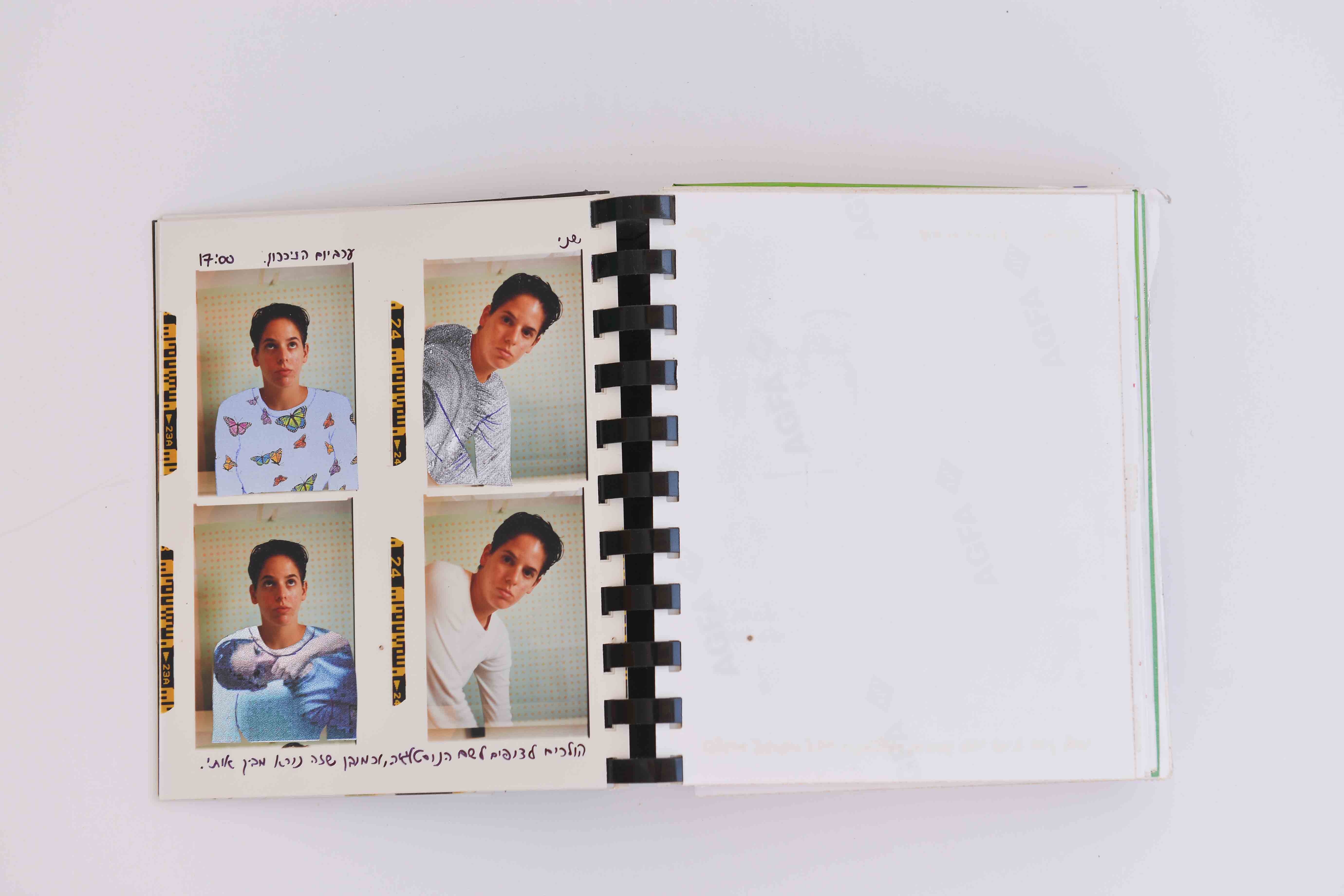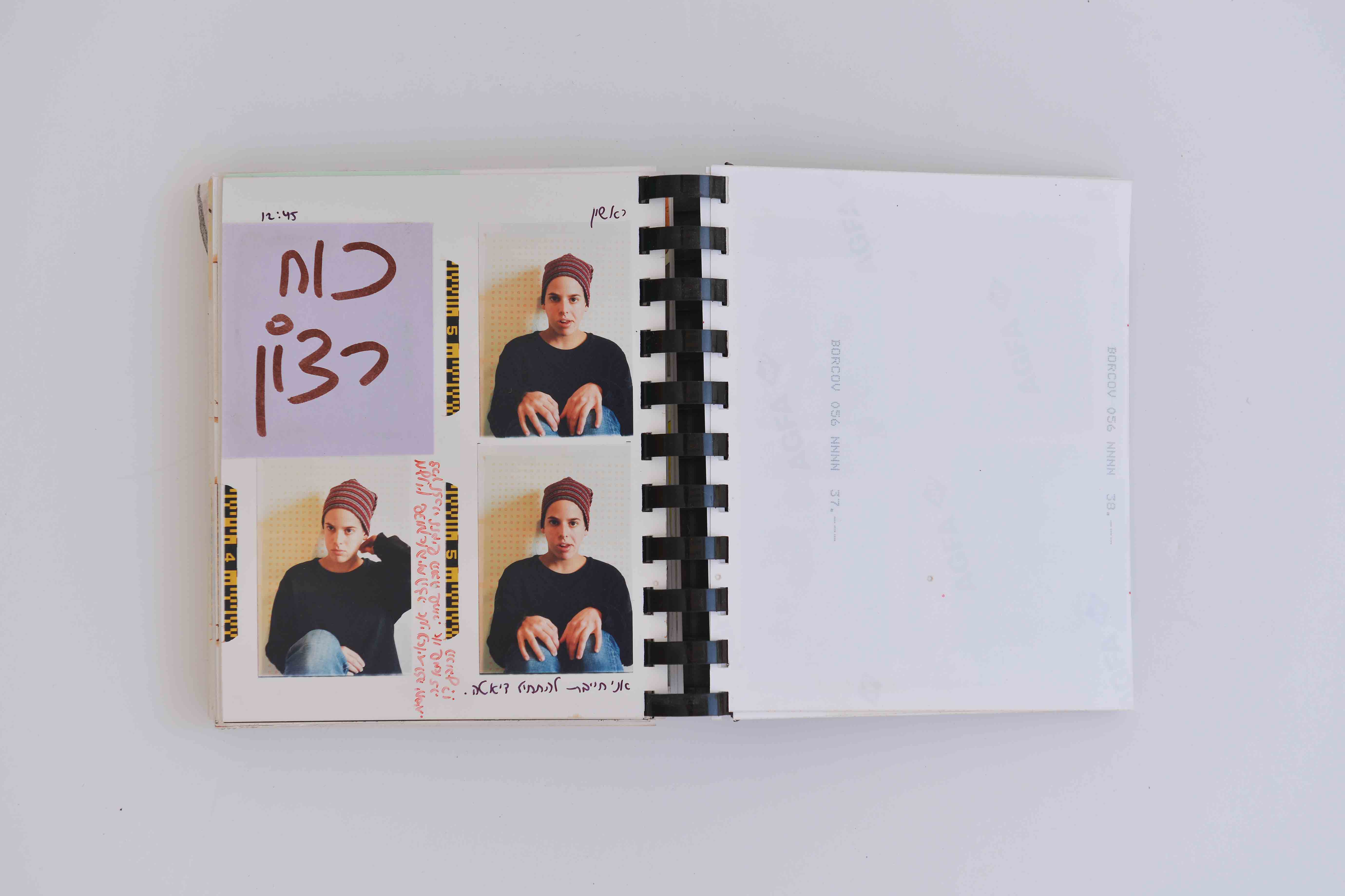 את היומן הזה צילמתי במשך כמעט שלושה חודשים, בפברואר עד מאי 2000, עד שהתחלתי בסבב ועדות הקבלה שעשיתי לבתי ספר השונים לאמנות ולצילום בארץ. הצבתי מצלמה על חצובה בנקודה קבועה בחדר בבית הורי, המצלמה פנתה לשרפרף עליו הייתי יושבת, וברקע בריסטול שתליתי. המצלמה הזו היתה קבועה שם (מצלמה ידנית של אבי, כדי שאוכל להמשיך לצלם במצלמה שלי במקביל). הייתי מצלמת בכל יום שני פריימים בלבד. בדף נפרד כתבתי לי את היום, שעת הצילום, וכמה מילים על כל יום, כדי שאוכל לכתוב ליד התמונה בהמשך. את הפילמים נתתי לפיתוח ולהדפסה בצורת "קונטקט" ב"סטודיו בבורוכוב". הם היו מדפיסים את הקונטקטים שלהם בצורה כזו של שתי תמונות בדף. בהמשך, את דפי הקונטקטים כרכתי ואז התחלתי לעשות בהם את העבודה המשנית, ציורים, חיתוכים, מה שתחשק לי (וכמובן עדיף שיהיה מעניין ויראה לוועדות הקבלה כמה שאני יצירתית ומגוונת…).