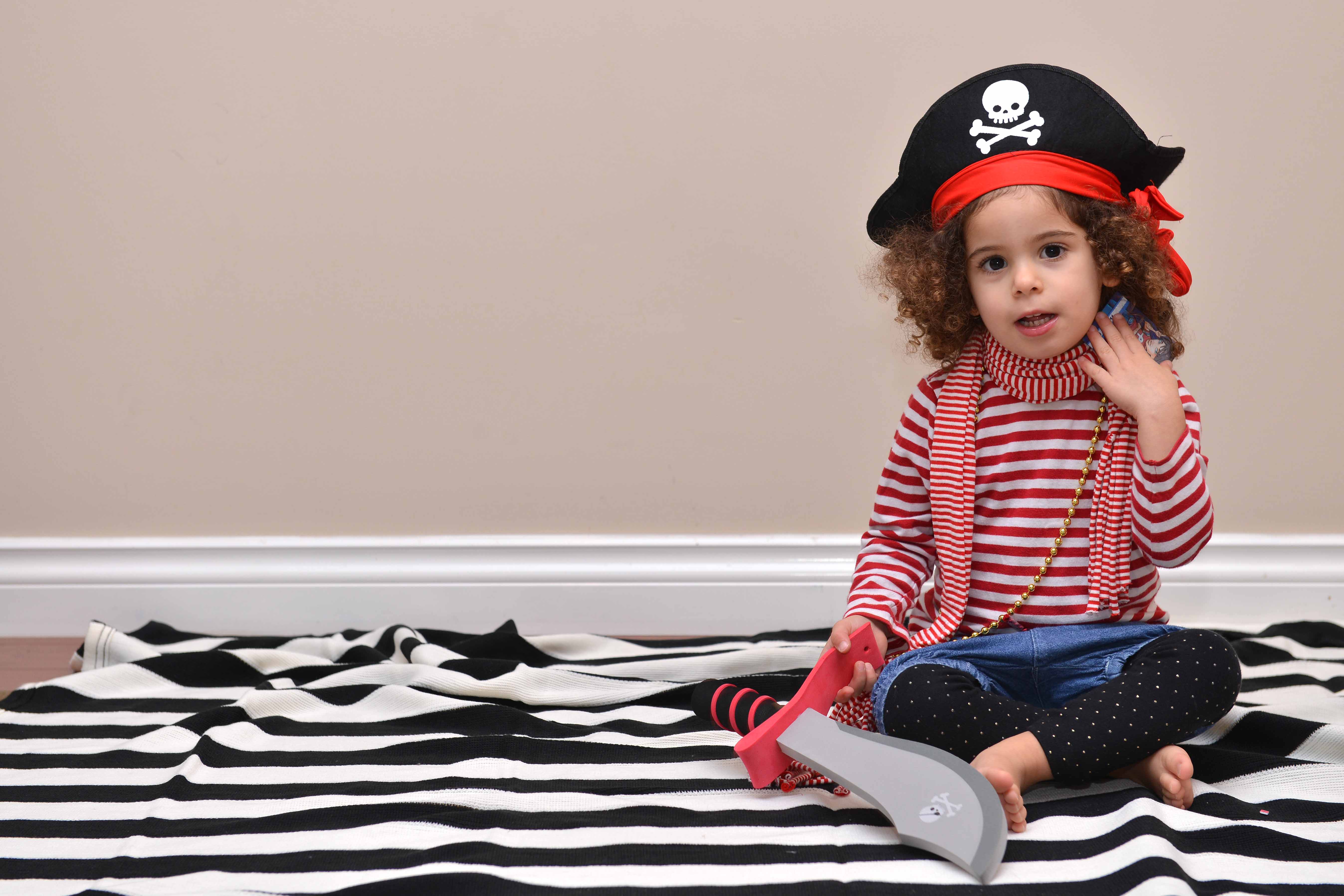חוץ מזה כמובן יש את עניין התחפושת. לפני כמה שבועות ביקרנו בסיאטל ונכנסנו לחנות "טארגט" גדולה (כל הזמן ירד גשם ולא היה לנו יותר רעיונות מה לעשות בחוץ). כשראינו את החלק העצום בחנות שמוקדש להאלווין חשבנו להקדים ולהתכונן מראש. שאלנו את הבנות למה הן ירצו להתחפש בהאלווין, ועלמה ענתה ללא היסוס: "פיראט!" תמר מיד הסכימה: "גם אני רוצה פיראט!" וכך קנינו כמה אקססוריז בחנות (כובע אחד, שתי חרבות ועשר רטיות – זה היה בעמדת יום ההולדת ולכן הכל היה זול ובכמות מצחיקה). באופן מפתיע גם השבוע, הן עדיין עמדו בהחלטתן להתחפש לפיראט ולא התחרטו ובחרו באיזו נסיכה. גיליתי שבנכר, וללא מחסן הבדים/אקססוריז מהילדות/מצבור חפצים שאספתי לאורך השנים – אני הרבה פחות יצירתית. שלושתינו התחפשנו לפיראטיות לובשות פסים, בנדנות ומעוטרות במעט אקססוריז. מה שלא פגם לנו כלל בהנאה (מתברר גם שלבננות בכלל לא אכפת אם תפרתי בעצמי את התחפושת או שקנינו קצת אקססוריז ב"טארגט", העיקר שמתחפשים, נוט טו סלף).