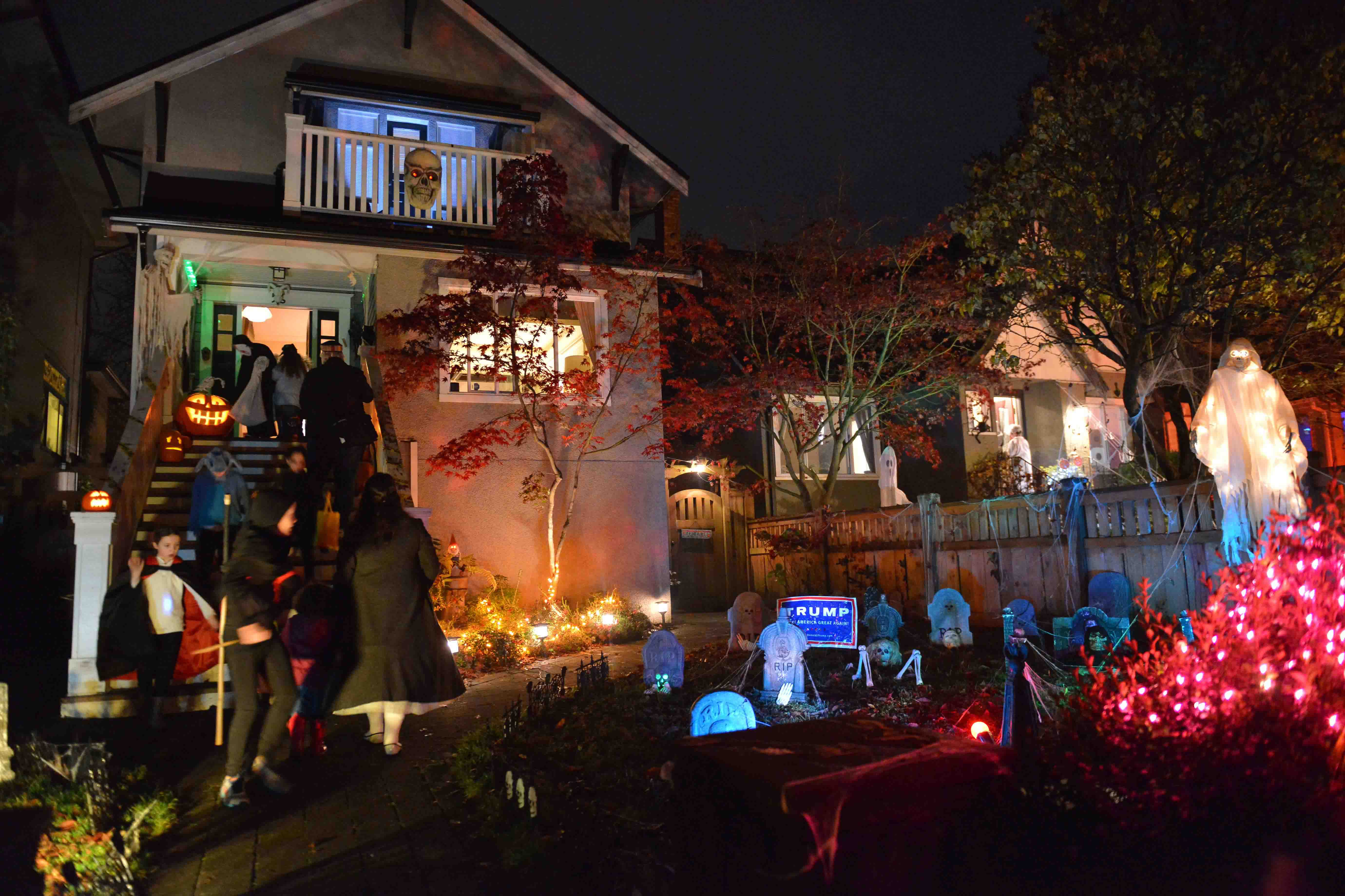 עם רדת החושך הלכנו לעשות "טריק אור טריט" בבלוק סמוך שנחשב בלוק עם בתים מאוד מקושטים ומשפחות שממש נהנות לחגוג את החג. ראינו בתים מקושטים בטירוף! באמת, זו לא הגזמה לומר שקצת "טירוף" מעורב בעניין. חלק מהבתים נראו לקוחים מתפאורה של סרט אימה. מקורי עכביש וחלקי גופות מציצות מהאדמה, דרך בית קברות שלם בחצר, ועד שימוש בתאורה, עשן, הקרנת סרטונים וקולות מפחידים. ראינו בית שבחצר שלו הוצבו בובות חלון ראווה וארון מתים בסצנת-הלוויה שלמה. והבננות – בלי שום בושה הלכו בית-בית, דפקו בדלת, אמרו "טריק אור טריט" ולקחו ממתק. תודה רבה וחג שמח, ויאללה לבית הבא. שוב נדהמתי משיתוף הפעולה וחוסר הציניות של התושבים. אנשים מבוגרים, חלקם מחופשים, יושבים ערב שלם בבית שלהם (שאותו טרחו וקישטו במשך כמה ימים) והם פותחים את הדלת לכל ילדי השכונה המחופשים. לכל ילד אומרים משהו נחמד על התחפושת או סתם "חג שמח" ומחלקים ממתקים בנדיבות!