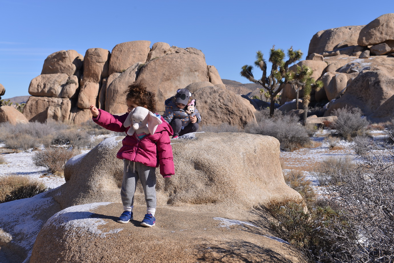 וקר. מאוד. כשנכנסנו לשמורה הטמפרטורה בחוץ היתה 7° מעלות. כשהגענו למסלול היו כבר 0° מעלות (לפי מד הטמפ. של האוטו). יצאנו ברוב התלהבות לטייל במסלול קצר, מייל אחד, הליכה רגועה ומישורית של שעה בערך, לפי המלצת הספר (פארקים לאומיים בארה"ב/מסלולים). אבל לא היינו במיטב בגדי החורף שלנו (בכל זאת, קליפורניה) והיה קר מאוד. ובמסלול הליכה בין בולדרים ענקיים, שרידי עצים, מני צמחים מדבריים משונים, וקצת תיירים כמונו, שבאו להעביר את ערב חג-המולד פה בין העצים האלה. אחרי כשעה טיול, נהיה ממש קר. כולנו קופאים, ובעיקר תמרול שלא דיברה כמעט בכלל (והיא הרי כל הזמן מדברת או שרה), למרות שהיא שמה את דמבו בתוך המעיל והוא קצת חימם אותה.
