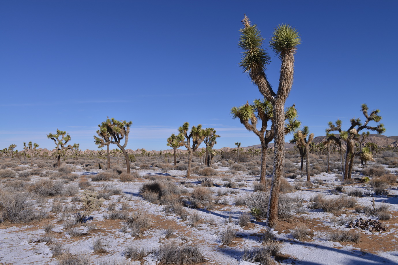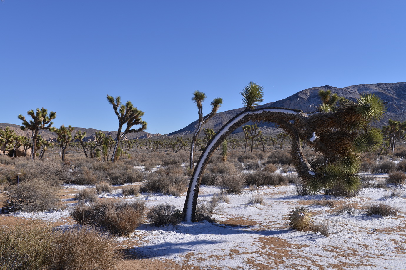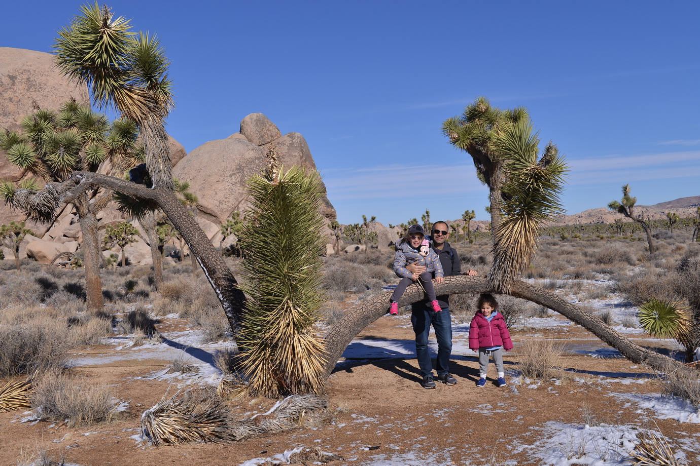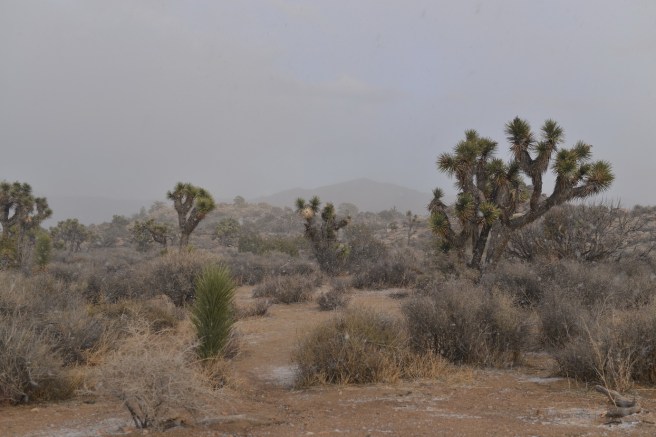 למחרת בבוקר חזרנו לשמורה לעשות מסלול מומלץ נוסף. הפעם היינו לבד על הכביש, לבד במסלול. בכל זאת הבוקר של חג-המולד בצפון אמריקה. טיילנו לנו בשמש החמימה בין עצי הג'ושוע המוזרים, שהרוח החזקה שנשבה בלילה הטיחה בהם שלג. השלג קפא, אבל רק מצד אחד של העץ. העצים עומדים ועליהם פס צר של שלג קפוא, רק מהכיוון שבו נשבה הרוח.