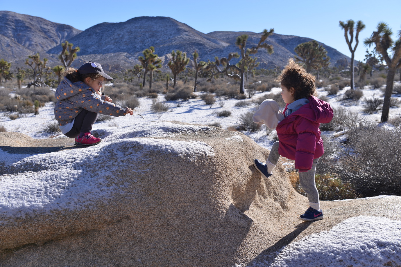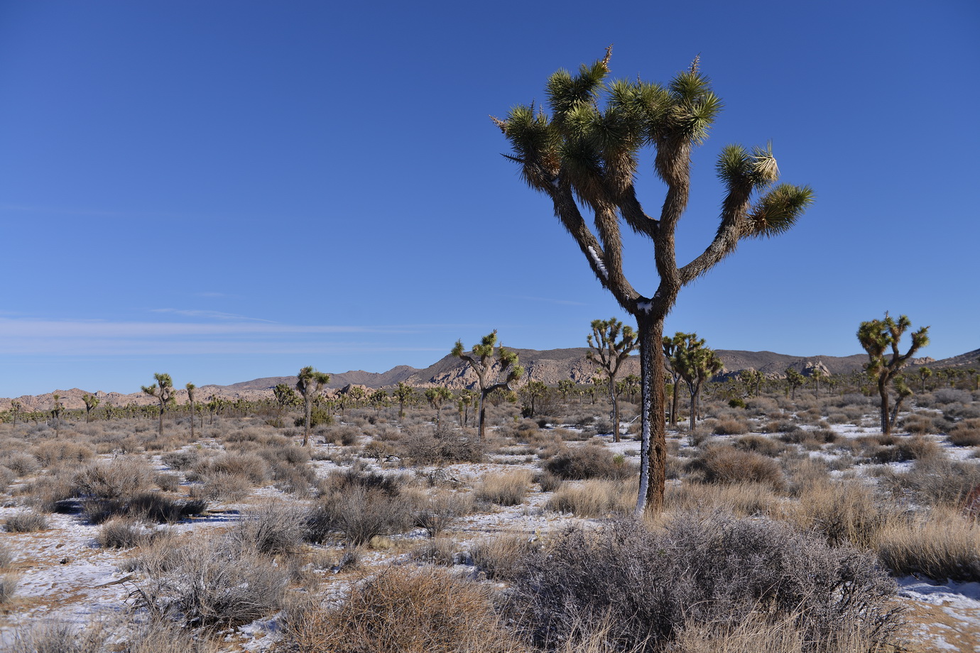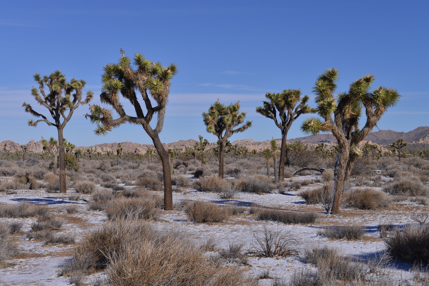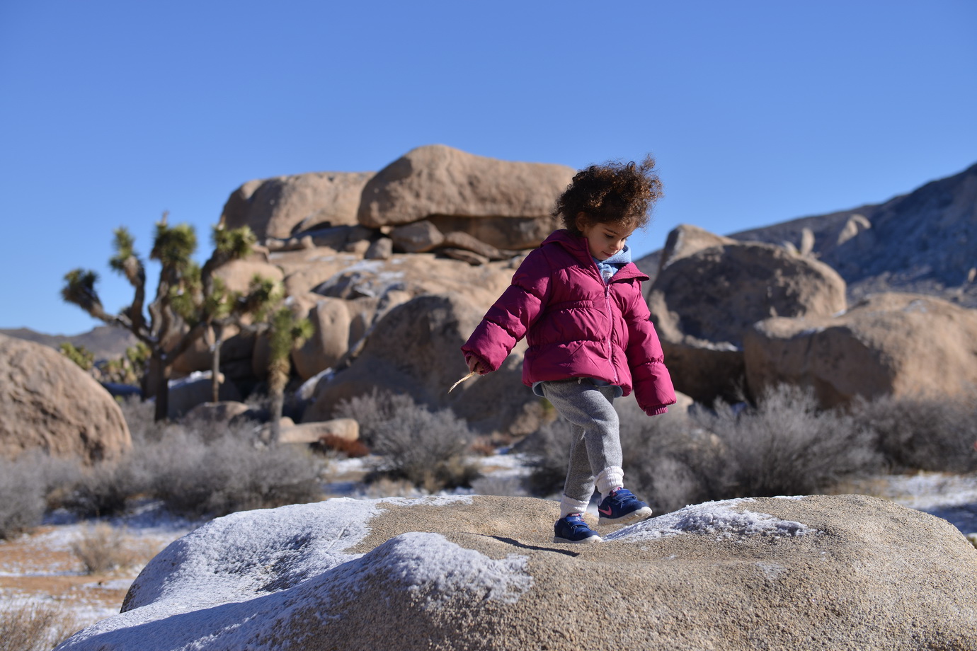 למחרת בבוקר חזרנו לשמורה לעשות מסלול מומלץ נוסף. הפעם היינו לבד על הכביש, לבד במסלול. בכל זאת הבוקר של חג-המולד בצפון אמריקה. טיילנו לנו בשמש החמימה בין עצי הג'ושוע המוזרים, שהרוח החזקה שנשבה בלילה הטיחה בהם שלג. השלג קפא, אבל רק מצד אחד של העץ. העצים עומדים ועליהם פס צר של שלג קפוא, רק מהכיוון שבו נשבה הרוח.