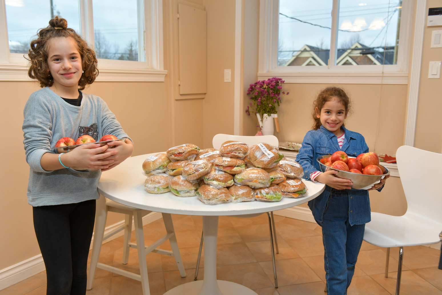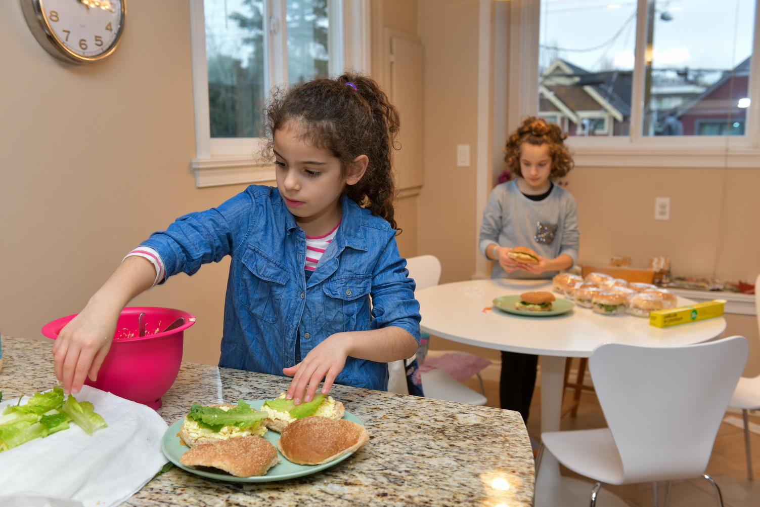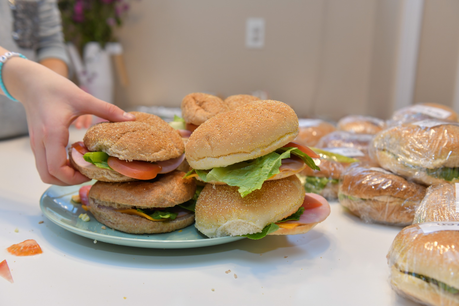 כשהם חזרו עמדנו והכנו ארבעים סנדויצ׳ים משלושה סוגים שנבחרו כטעימים ושיהיו פופולריים ביותר בעינינו: סלט ביצים, נקניק+גבינה ועוף. כולם שודרגו בתוספת מיונז, חסה ועגבניה, ונעטפו בניילון נצמד (לא מצאנו פיתרון יעיל אחר שלא מזיק לאיכות הסביבה. כנראה שאנחנו מצליחים לתרום לעולם באופן אחד בלבד בכל פעם).
