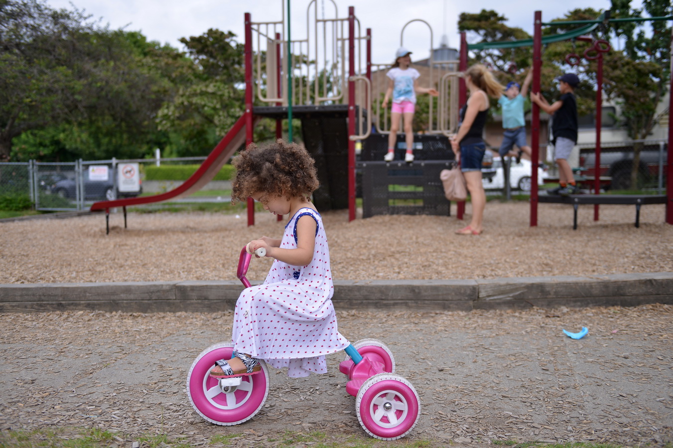 בגינת המשחקים: פזורים משחקים (תלת אופן, משאיות, דלי) שאנשים השאירו להנאת הילדים. מישהי בשיא הטבעיות מורידה שמלה ומשתזפת על שמיכה על הדשא בגינה. אף אחד לא מרים גבה.